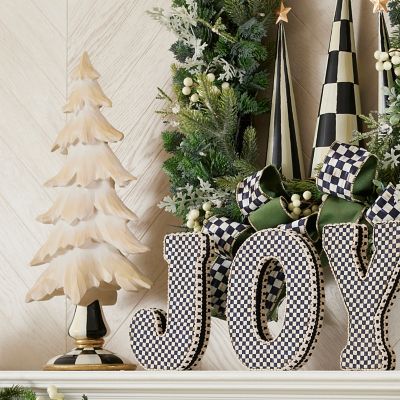 Create a winter wonderland with this whitewashed short tree that has a finish resembling carved wood. It sits on a pedestal trimmed with Courtly patterns.