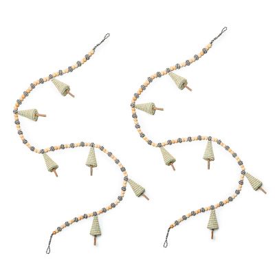 Make your mantel or tree merry with this set of two garlands. They’re made of wood and threaded beads and accented with hanging trees that are decorated with beads and jute trim.