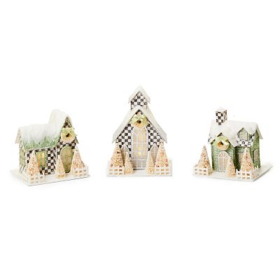 Make the mantel merry with this set of three illuminated mini paper houses that includes a church and two cottages, all decorated with Courtly Check® and dusted with snowy glitter.