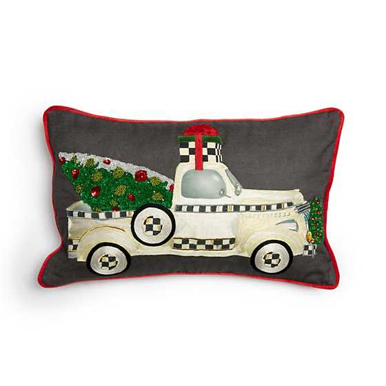 Add comfort and joy with our one-of-a-kind seasonal pillows. The Farmhouse Holiday Truck Pillow features our Farmhouse Holiday Truck, embellished with embroidery, hauling a beaded Christmas tree on a front of grey cotton linen. It’s finished with red cotton velvet piping.