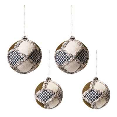 Make the tree merry and bright with this set of four (two large and two medium) farmhouse-style, patchwork ball ornaments that mix neutrals with Courtly Check®. They’re finished with black and ivory trim.