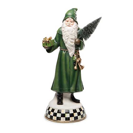 The Farmhouse Santa is a festive and fresh accent for your holiday tabletop. This highly detailed Santa wears a forest green cloak and cap, holding a bottle brush tree and a ribboned package, while standing on a Courtly Check® base. Place this special handmade and hand-painted figure on a mantel or tablescape to get all the attention it deserves.