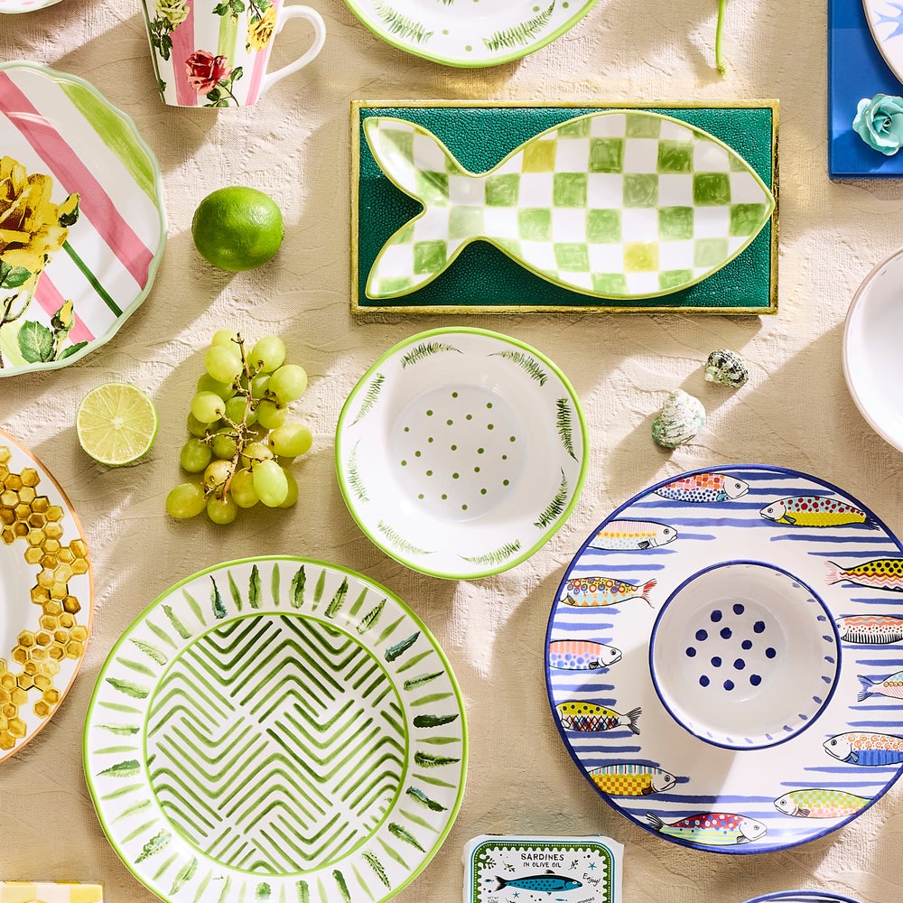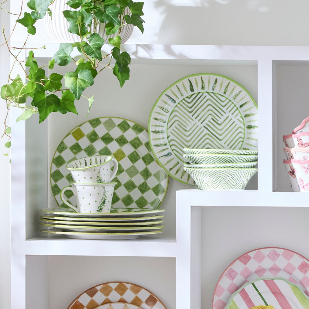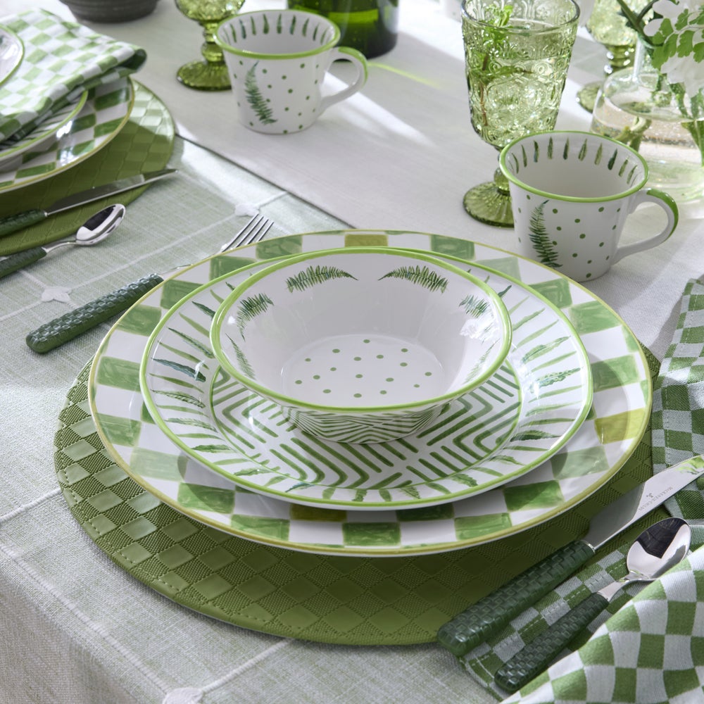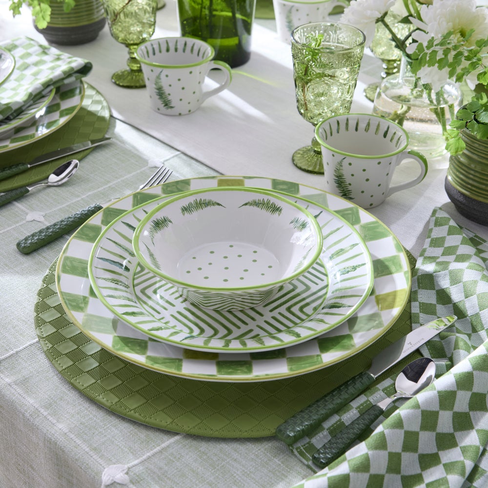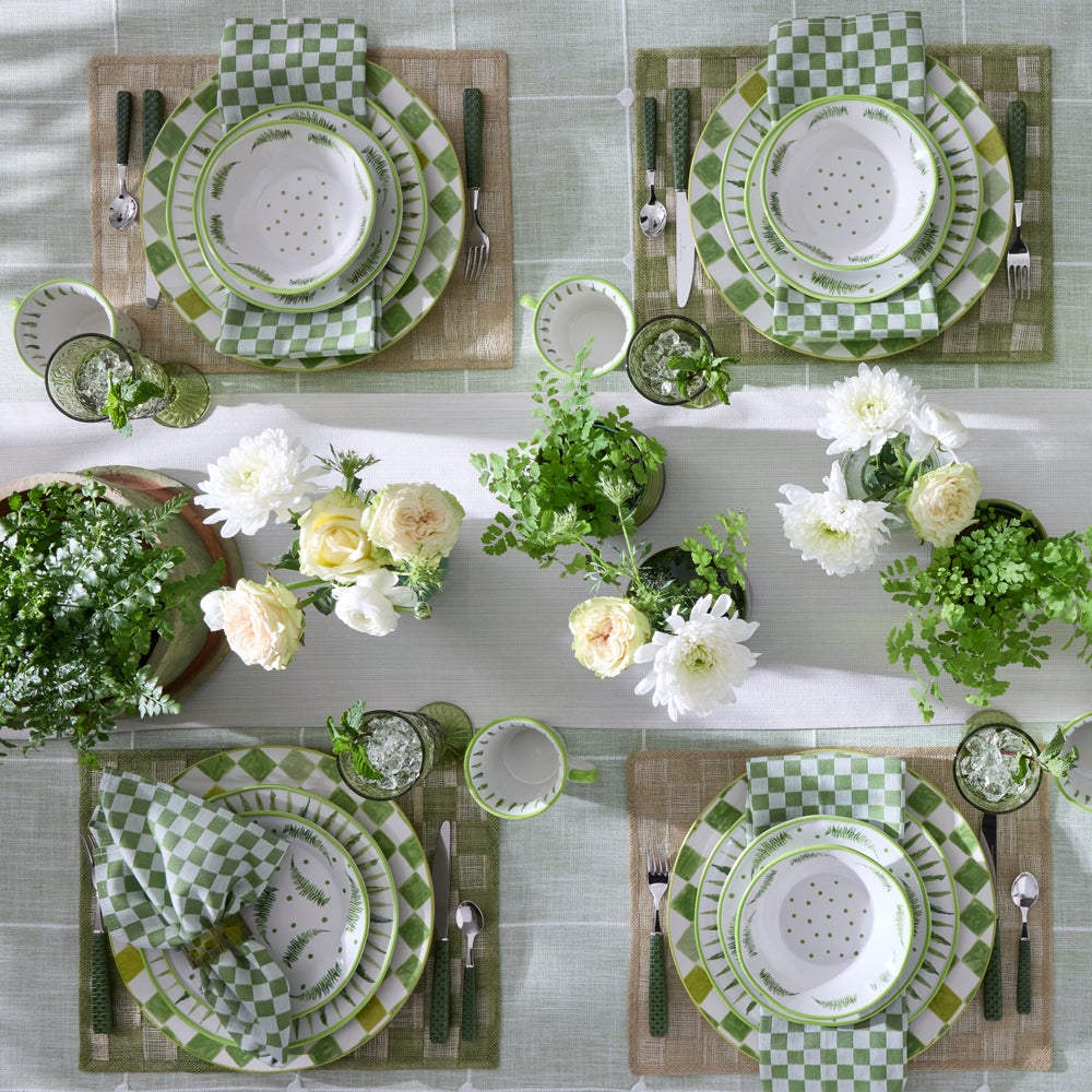 Get lost in playful greenery and verdant patterns of our Fern Forest Dinnerware. Designed for everyday use, it’s finely crafted from durable made-in-Portugal stoneware that’s both dishwasher- and microwave-safe, decorated with hand-applied transfers, and finished with a hand-painted rim.�Pair with Green Check stoneware silhouettes to bring the great outdoors to every tabletop moment.