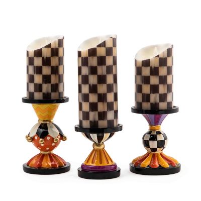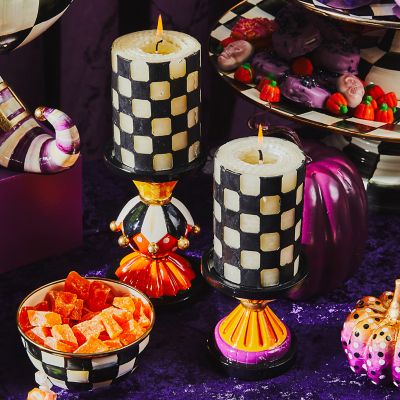 Set Halloween aglow with this set of three pillar candle holders. Each is a different height and feature hand-painted Courtly patterns, accented with orange, purple, and black.