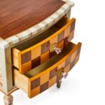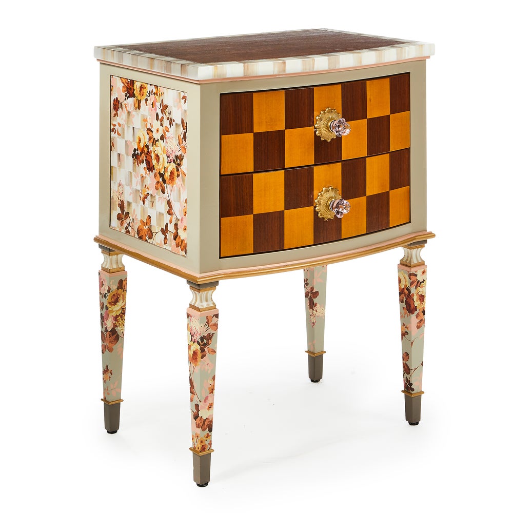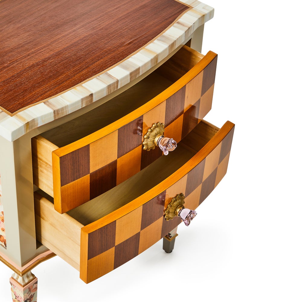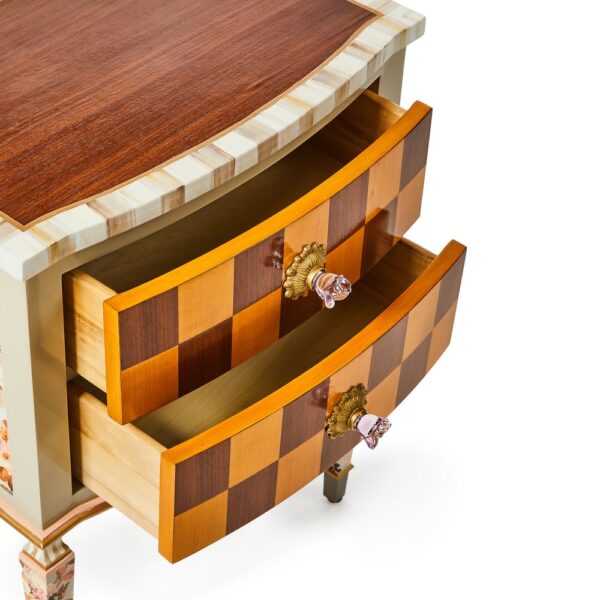 This accent chest makes a dramatic statement. It features stained maple veneer on top and maple and walnut marquetry on the drawer fronts, which are accented with pink flower-shaped glass knobs. Our Aurora artisans add hand-painted Mocha Check and Stripe, plus floral paper on the sides and legs.
