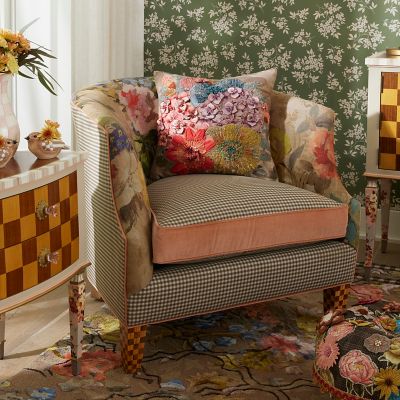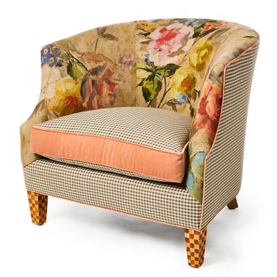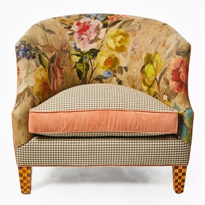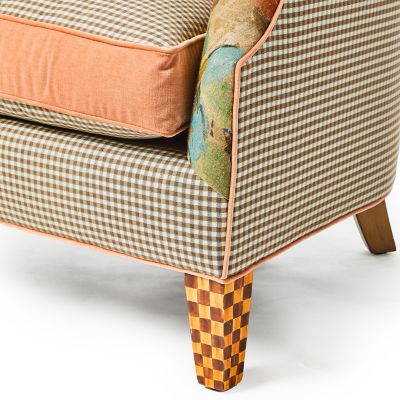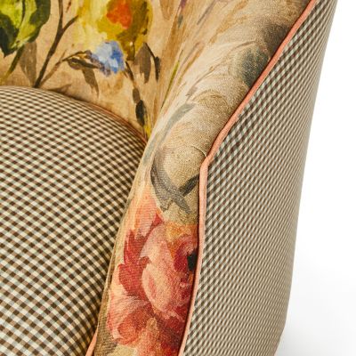 Sit back in style in this accent chair, featuring a tight-back silhouette over a domestic hardwood frame. It’s upholstered in a sepia-toned, floral linen fabric, with brown gingham on the single cushion, sides, and back, and terra cotta-colored velvet on the boxing. The front legs are hand-stained in checks by our Aurora artisans.