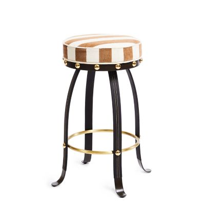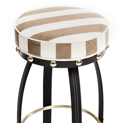 Please, be seated in The Entertaining Kitchen™ on this bar stool. Made of iron, it has stylishly shaped metal legs wrapped in leather and trimmed with brass button detailing. It’s fitted with a comfortable cushion upholstered in brown chenille stripe.
