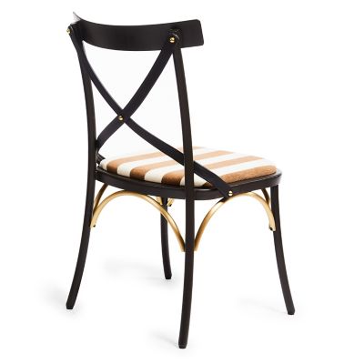 Please, be seated in The Entertaining Kitchen™ on this chair. Made of iron, it has stylish leather straps crisscrossing its back and is fitted with a comfortable cushion upholstered in brown chenille stripe.