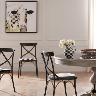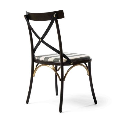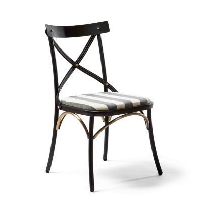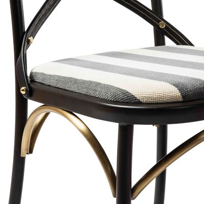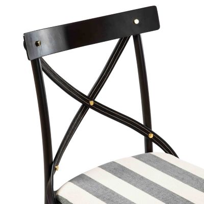 Please, be seated in The Entertaining Kitchen™ on this chair. Made of iron, it has stylish leather straps crisscrossing its back and is fitted with a comfortable cushion upholstered in grey chenille stripe.