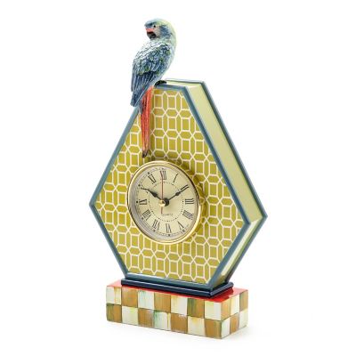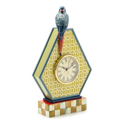 Sync your schedule to MacKenzie-Childs time with this pretty parrot clock. A hand-painted feathered friend rests atop a clock that’s decorated with a relief lattice pattern.