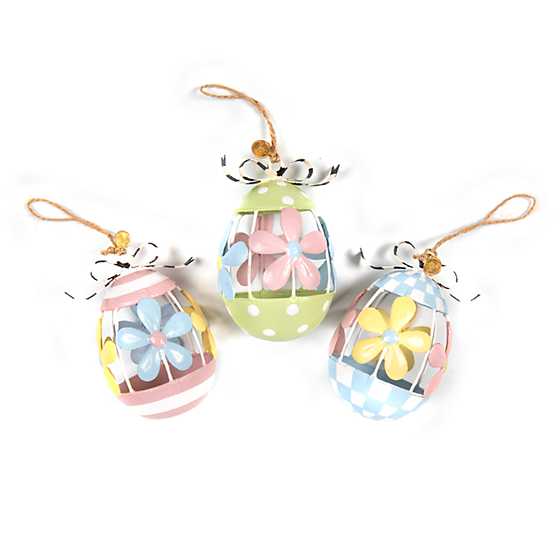 Our set of three hand-painted Florabunda Daisy Egg Ornaments make a charming addition to your Easter tree. Made of tin, these are dotted with daisies and topped with checked bows.
