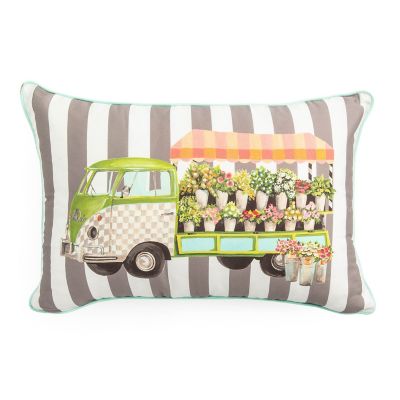 This pillow is always in bloom, featuring the printed image of a floral delivery truck on a background of grey stripes.
