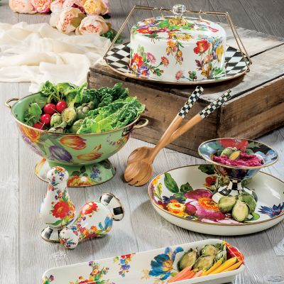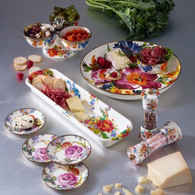 The Flower Market Baguette Dish really does it all. Of course, as its name implies, it’s charming holding a fragrant baguette on the dining table. But its ample, elongated shape can serve all types of food. It even goes out of the kitchen and could hold pencils in a home office or washcloths in a bathroom. Heavy-gauge, hand-glazed steel underbody with hand-applied floral transfers.