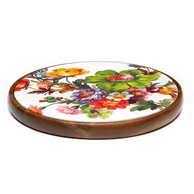 The Large White Flower Market Trivet might be one of your kitchen’s handiest helpers. You’ll handle the hot stuff in style, with an acacia wood base and our popular White Flower Market flower m pattern on top, done in hand-glazed enameled steel. This also makes a convenient way to rest one of our 3 Quart Tea Kettles when it’s piping hot from the stove.