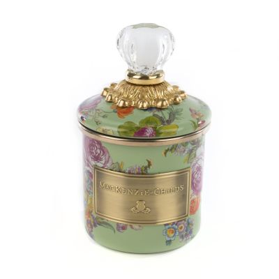 Add to the endless possibilities for our enamel canisters with the Mini Green Flower Market Canister. Our smallest sized canister, the Mini stands handsomely alone or harmonizes delightfully in a set. Keep it in the kitchen or invent new uses around the house. It’s perfect for cotton balls and swabs in the bathroom, pens and pencils in the office, or knickknacks and doodads in the kids’ room. Color glazed in green, it’s decorated with hand-applied fanciful botanical transfers that recall a lush English garden in the peak of summer, and the lid is topped with a clear glass knob.