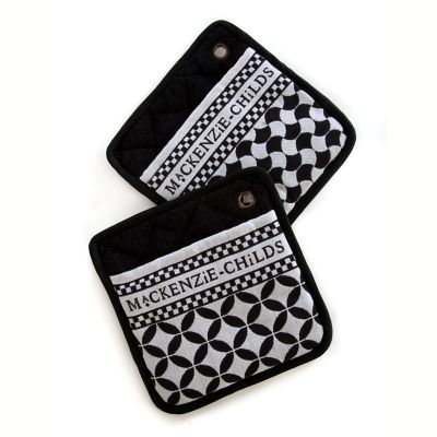 Handy in a hot spot, our set of two Black Geo Pot Holders protect your hands from piping-hot pots and pans. Featuring a mix of crisp black and white patterns, as well as our fetching logo, they’ll look lovely hanging from a hook in your kitchen (who could bear to keep this pretty pair stashed away in a drawer?)