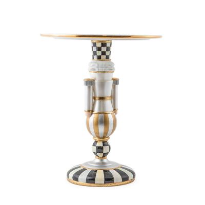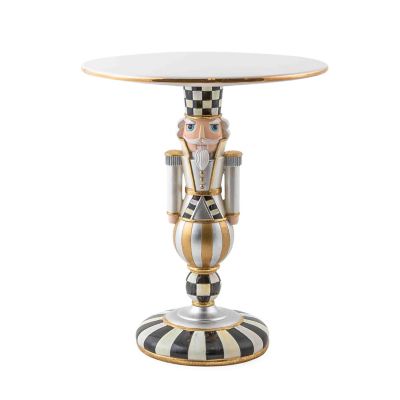 This nutcracker pedestal platter, hand-painted in gold, silver, and Courtly patterns, is at your service, holding a ceramic platter for presenting your prettiest holiday culinary creations.