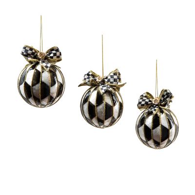 Trim the tree with a set of three round Capiz ornaments done in different hand-painted black and white patterns and finished with Courtly Check® bows.