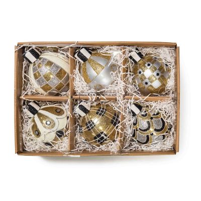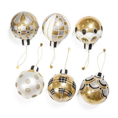 Trim the tree with this set of six ball ornaments, featuring different black, white, and gold patterns, topped with glittered black and white stripe caps.