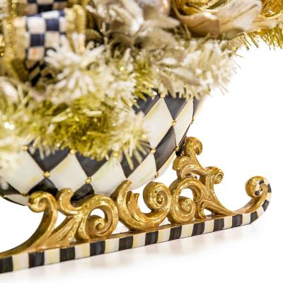 Top the tabletops with this arrangement of gold tinsel stems, everlasting florals, shatter-resistant ornaments, and gold filigree ribbon. It’s set in a harlequin diamond-patterned sleigh, finished with gold leaf.