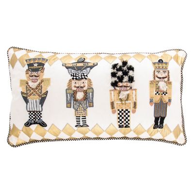 Deck the sofa with this one-of-a-kind holiday pillow, featuring a quartet of glamorous nutcrackers done in beading and machine embroidery on a background of polished cotton, accented with printed harlequin. It’s finished with black and white check piping.