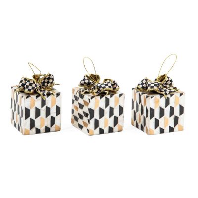 Trim the tree with a set of three square Capiz ornaments done in hand-painted black, white, and gold patterns and finished with Courtly Check® bows.