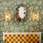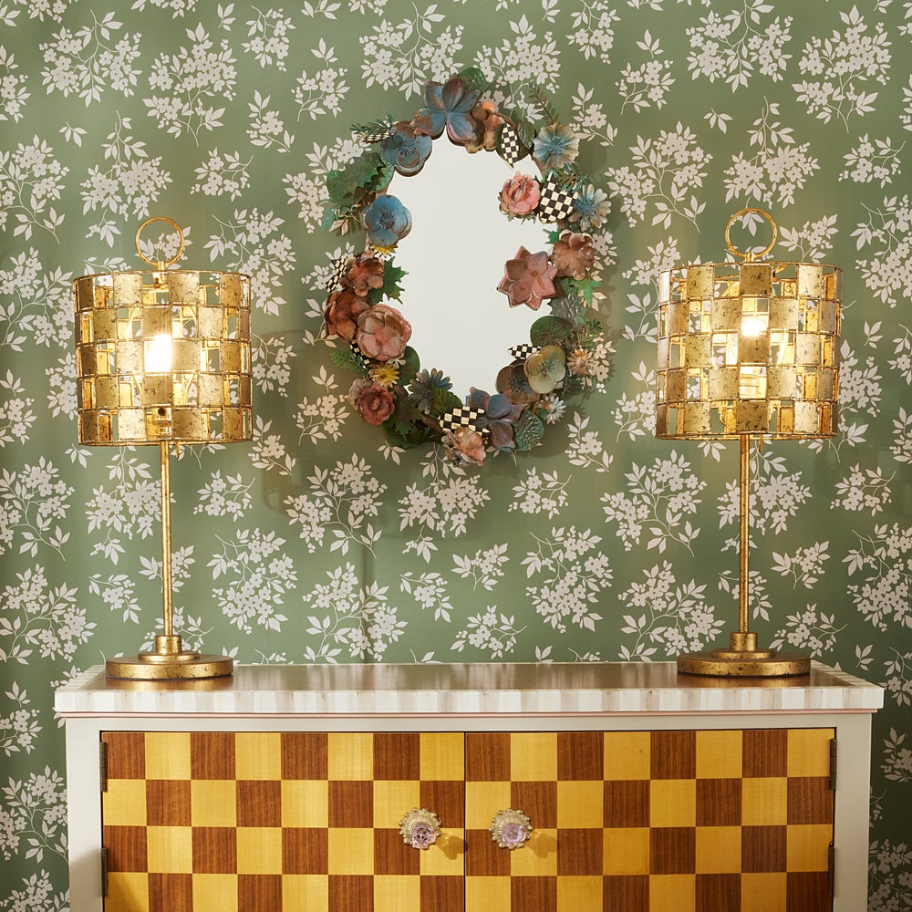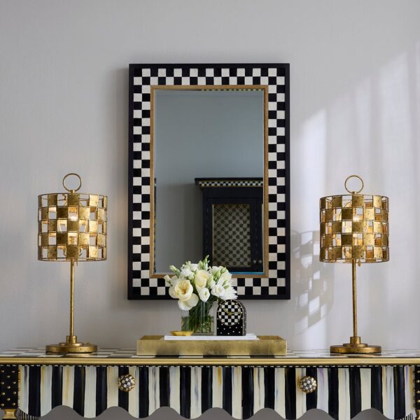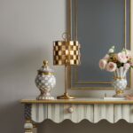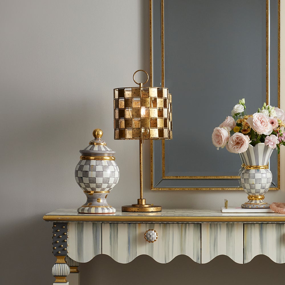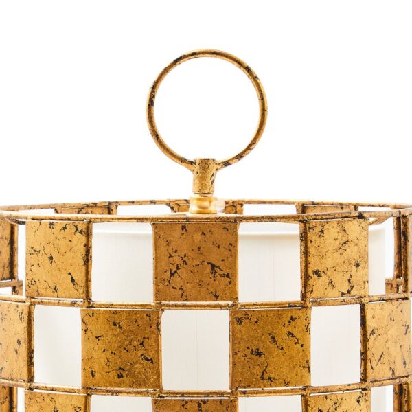 Be enlightened by this table lamp that features an outer metal shade with open and closed checks, finished with 14K gold leaf, which wraps around an inner fabric drum shade.
