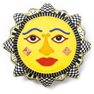Here comes the Good Day Sunshine Pillow! The sculpted shape of this printed pillow is embellished with embroidery, beads, outlined in an array of black and white patterns and bordered with chartreuse.