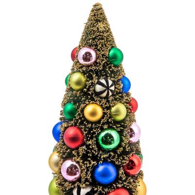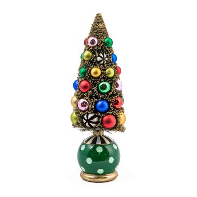 Deck the tabletops or the mantel with this nostalgic small bottle brush tree decorated with small shatter-resistant ornaments, accented with gold glitter, and set in a base of green with dots and Courtly Stripe.