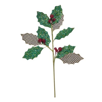 Add delightful dimension to the Christmas tree or a wreath with this holly spray, trimmed with glittered leaves of green and Courtly Check®, accented with red berries.