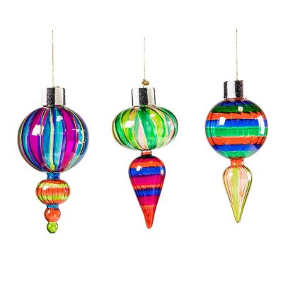 Trim the tree with this set of three glass finial-style drop ornaments, featuring hand-painted patterns, and topped with glittered black and white striped caps.