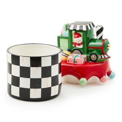 Deck the tabletops with this hand-painted lidded dish that’s trimmed with checks, stripes, and gold lustre. The top, decorated with a holiday train, lifts to hold treats.