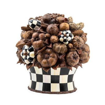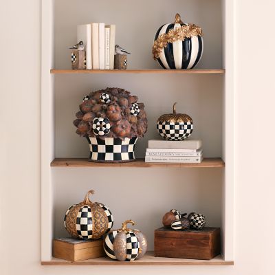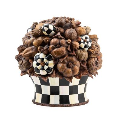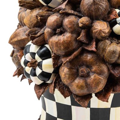 Top the harvest table with an elegant centerpiece, featuring pumpkins and acorns finished to mimic carved wood along with hand-painted Courtly Check®. The base is also Courtly Check.