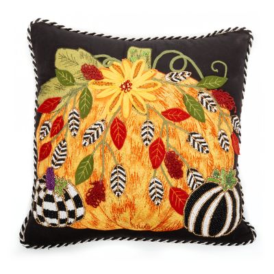 Celebrate the splendor of fall color with the Harvest Pumpkin Pillow. Featuring a large pumpkin embellished with beads, applique, and dimensional embroidery, this pillow quickly sets the scene for fall. Twisted black and white cording provides the finishing touch.