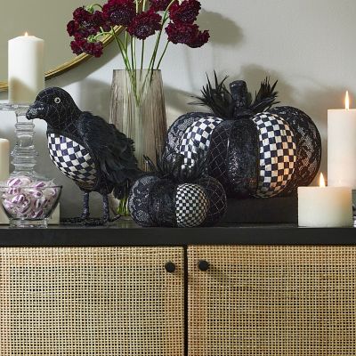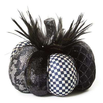 Take your pick from our most unusual pumpkin patch with this small black pumpkin, featuring black velvet, faux suede, lace, and Courtly Check®. It’s topped with black feathers and a silver leaf stem.