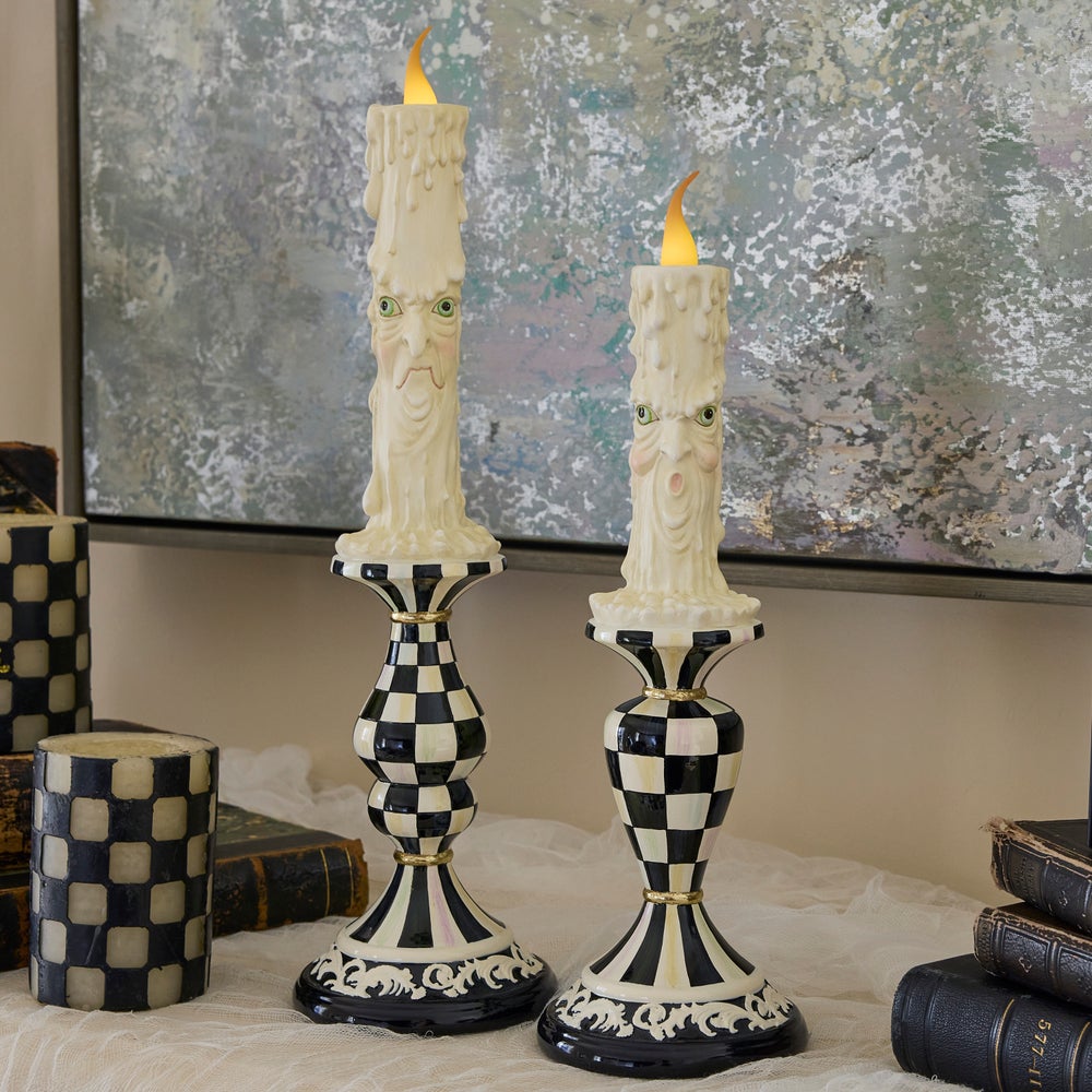 Bring the playful spirit of spooky season to life with the Haunted House Spooky Illuminated Candles, Set of 2. These candles glow with a soft, haunting light and are adorned with characterful faces Courtly Check accents. Perfect for adding a delightfully spooky vibe to your Halloween decor.