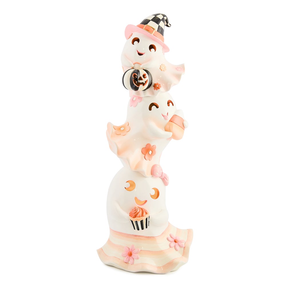 Add a bewitching touch of elegance to Halloween with the Hocus Pocus Illuminated Stacked Ghosts Figure. Featuring three glowing ghosts in soft pastel shades, this charming figure brings a dreamy glow to your any festive display.