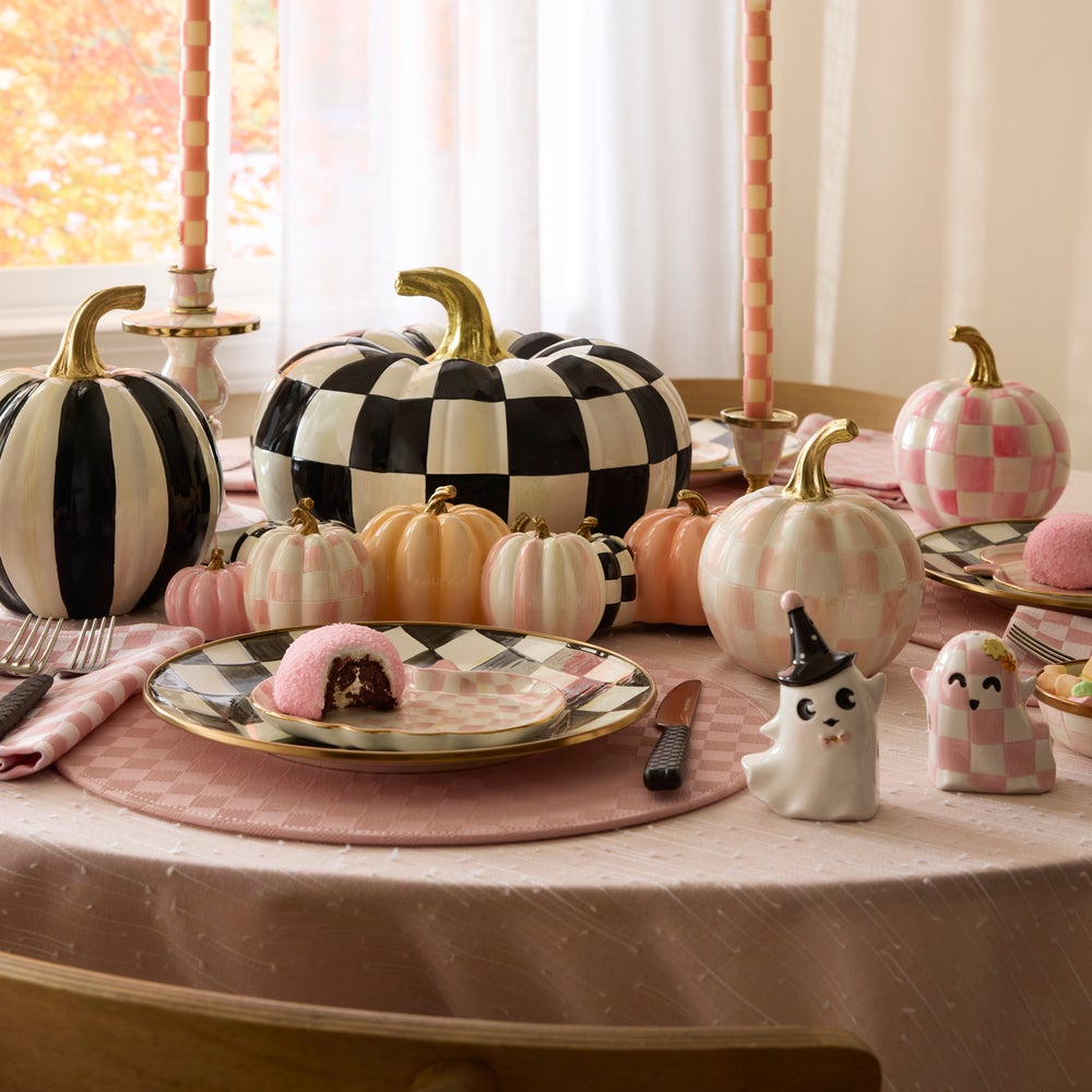 Add a bewitching touch of elegance to Halloween with the Hocus Pocus Pumpkin Cluster Arrangement. Featuring a mix of blush-toned and Courtly Check pumpkins accented with delicate gold details, the stunning arrangement brings a soft and sophisticated charm to your seasonal decor.