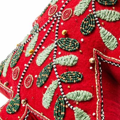 Add comfort and joy to your holiday home with this dimensional throw pillow, featuring a red felt Christmas tree embellished with beads, bells, and embroidery.