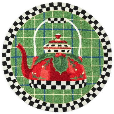 This hooked, 100% polyester round rug makes a welcoming holiday statement, featuring a holiday tea kettle embellished with holly on a background of green plaid. It’s trimmed with a border of black and white checks.