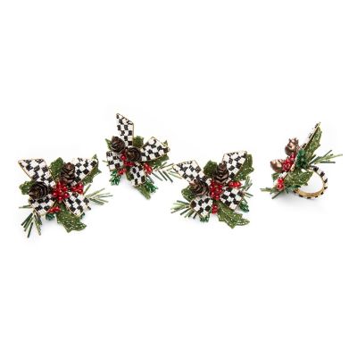 Add the jeweled touch of MacKenzie-Childs to your holiday table with our set of four Holly Holiday Napkin Rings. Featuring a medley of glass beads on a frame of iron and brass, there’s a band of black and white beads that wraps around the napkin.