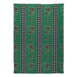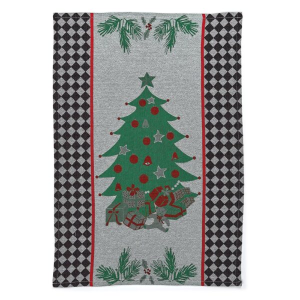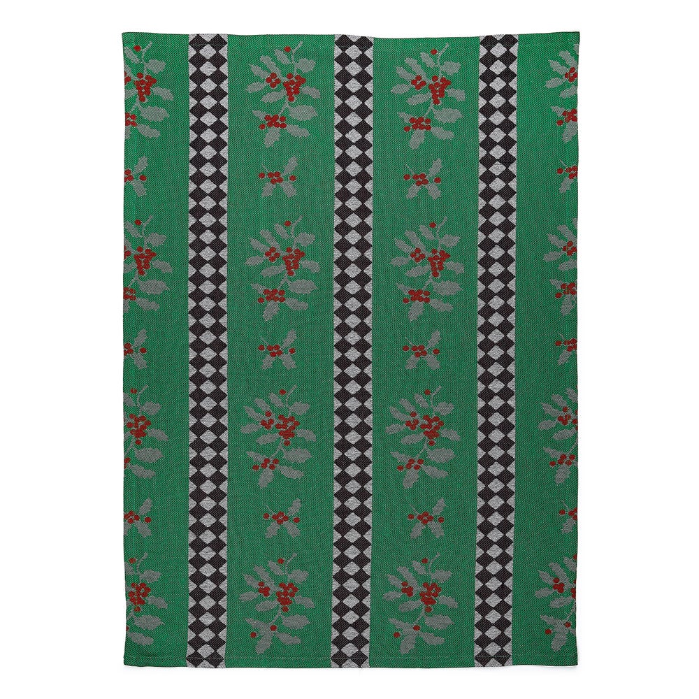 Fun and functional, this woven jacquard Holly and Holiday Tree Jacquard Dish Towel Set features holiday greenery and festive motifs, accented with diamond checks.