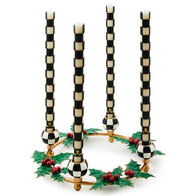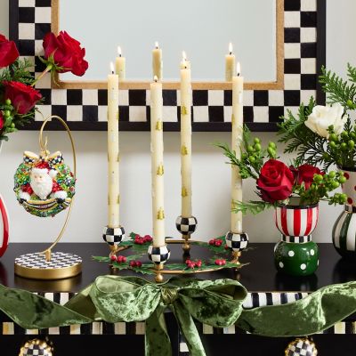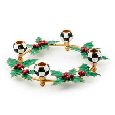 The holidays will be aglow with this ring-shaped candle holder. Made of metal, it’s decorated with motifs of holly leaves and berries, and holds four Courtly Check® holders for dinner candles.