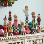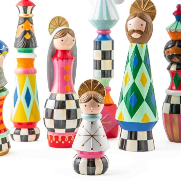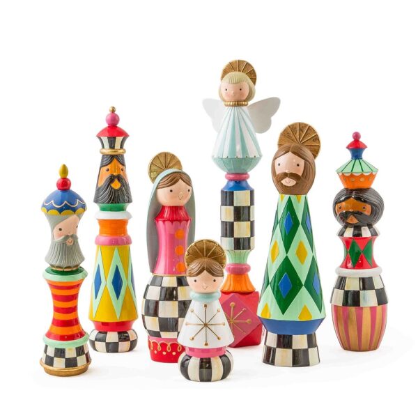 Tell the story of the first Christmas with this nostalgic seven-piece nativity set. Done in a midcentury style, the Holy Family, three kings, and an angel are hand-painted in bright patterns and accented with gold leaf.