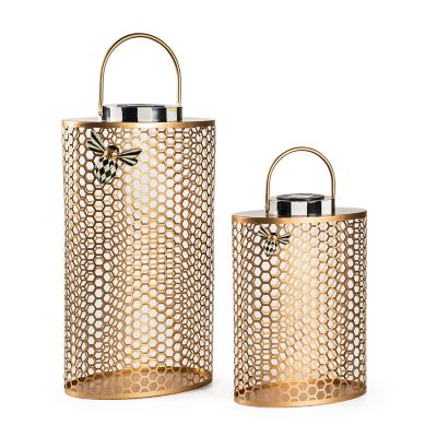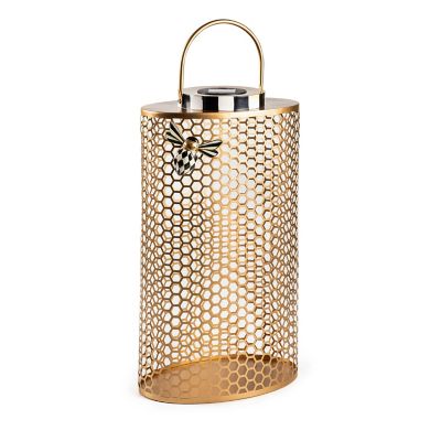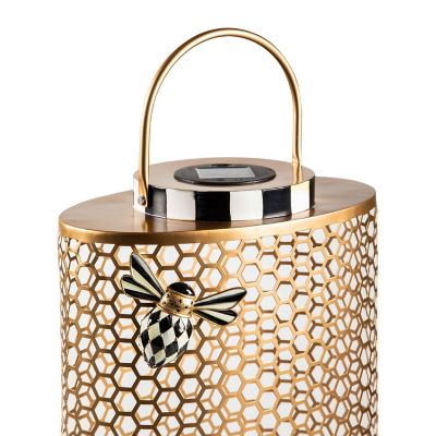 Enjoy every summer night with this large tin solar lantern that features a cutout honeycomb pattern and is trimmed with a magnetic decorative bee. It can be powered by battery, too.