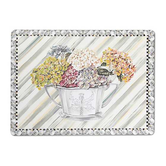 Heat-resistant lacquer surface, art print, hard-board substrate and cork back. Pieces may vary due to the handmade nature of each product. Imported.
