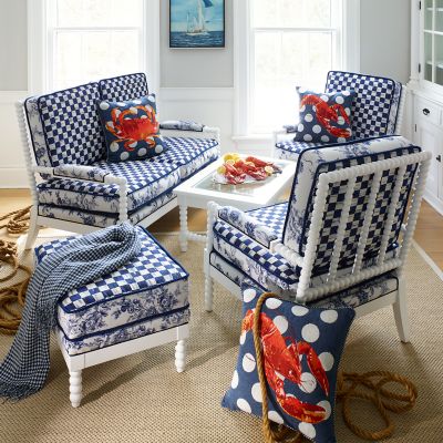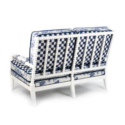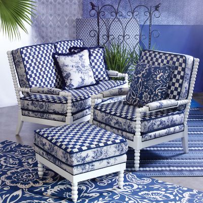 We love reinterpreting the classics—with a bold attitude, of course. Our Indigo Villa Outdoor Loveseat is a modern take on parlor style, now for the patio, in weather-ready materials and iconic MacKenzie-Childs patterns. We start with rugged-yet-chic white resin frames and dress them up in Sunbrella® outdoor cushions in eye-catching Royal Check and Wild Rose Royal Toile. Equally stylish on the lakeside deck of a beloved family camp as in an urban townhouse sunroom, this suite brings the indoors out with panache.