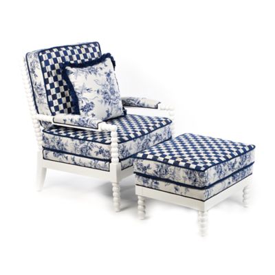 We love reinterpreting the classics—with a bold attitude, of course. Our Indigo Villa Outdoor Ottoman is a modern take on parlor style, now for the patio, in weather-ready materials and iconic MacKenzie-Childs patterns. We start with rugged-yet-chic white resin frames and dress them up in Sunbrella® outdoor cushions in eye-catching Royal Check and Wild Rose Royal Toile. Equally stylish on the lakeside deck of a beloved family camp as in an urban townhouse sunroom, this suite brings the indoors out with panache.