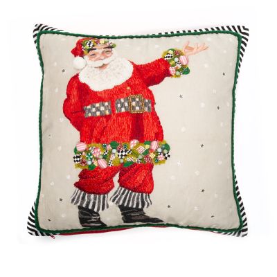 There’s no place like home for the holidays when it’s decorated with our beautiful one-of-a-kind pillows. The Jolly Father Christmas Pillow features an embroidered and beaded Santa on a cotton-linen background, embellished with small black and white polka dots. It’s finished with green piping and a stripped border.