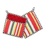 Handle the hot stuff with the set of two Jolly Woven Pot Holders. These pot holders have a bright striped pattern of red, green, chartreuse, and white, all trimmed with black and white checks. This kitchen necessity makes the path from oven to table a stylish one.